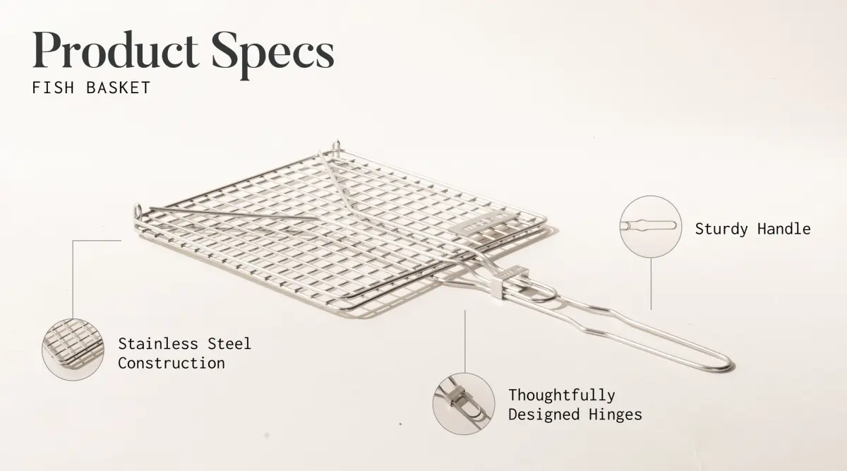 Like all of our cookware, we wanted our Fish Basket to be durable enough to withstand the wear and tear of a professional kitchen. Fish baskets are typically made of wire, and the wire we chose was 304 stainless steel. To ensure that the metal doesn’t rust, discolor, or otherwise degrade over time, the food grade wire is electropolished. This also allows it to withstand professional dishwashers as well as open flames up to 1000F.