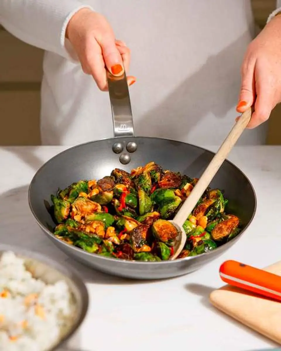 Heat your carbon steel pan over high heat. Add 2 T canola oil and enough brussels sprouts face down to just cover the bottom of the pan, do no overcrowd. Cook in batches.