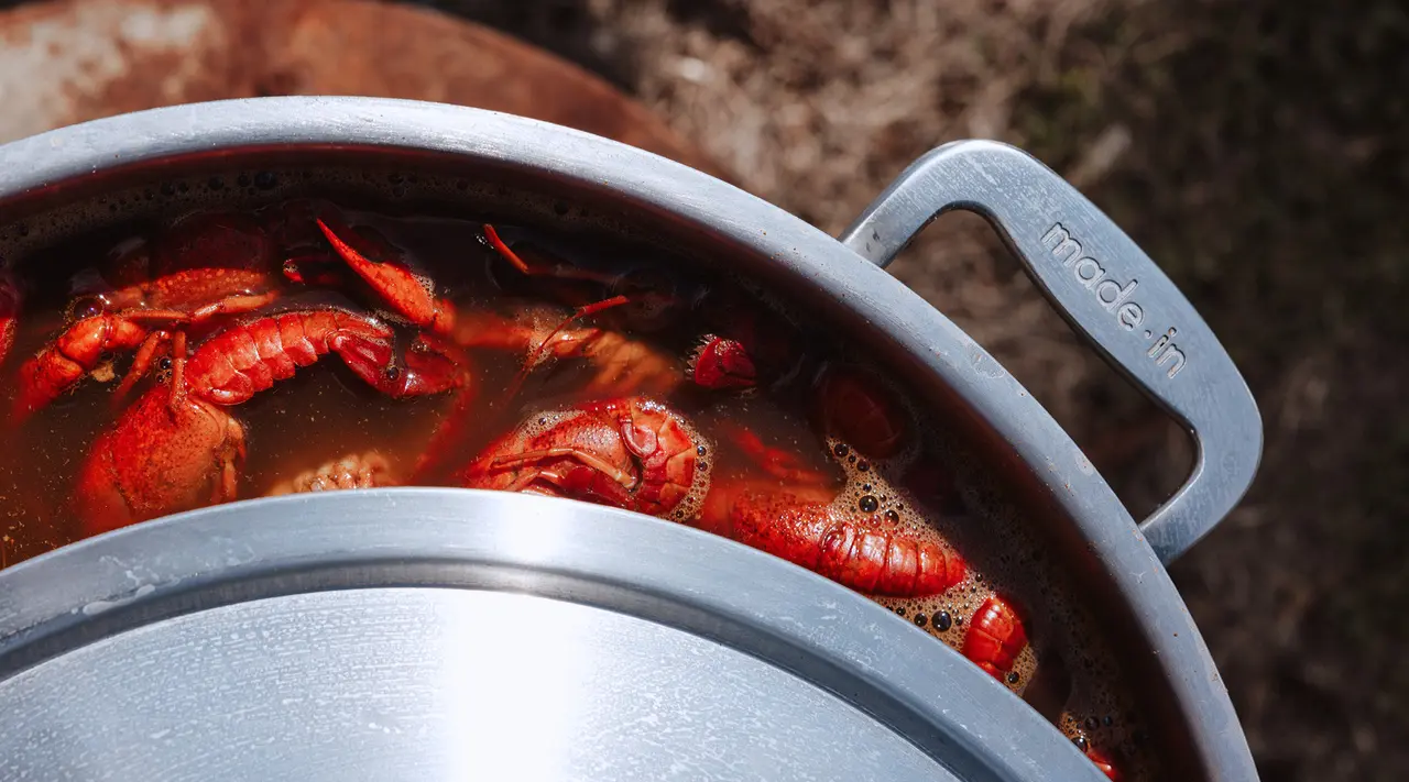 Looking for the right cookware for your boil? Our Chef-Sized Stainless Clad 32QT Stock Pot—which we put to the test for our office boil—can hold up to 30 pounds of crawfish.