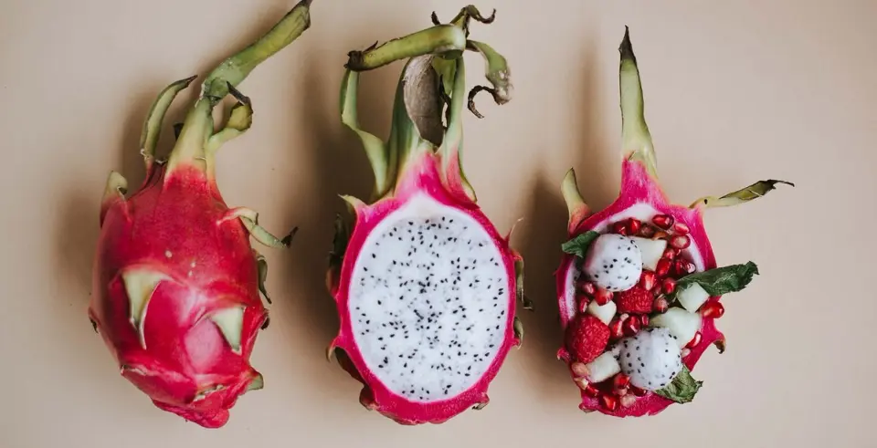 At first glance, dragon fruit may look like a fictional creation. Its thick and bright magenta skin tapers into green leaves that resemble the scales of a mythical dragon. It only gets more enchanting when you slice in. Inside, you'll find a juicy white or magenta flesh that's speckled with small black seeds.