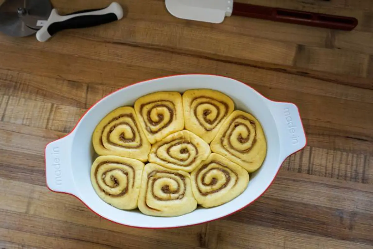 - Cut 1-inch slices and lay in a greased oval baking dish. It’s okay if the pieces aren’t touching. When they proof, they will expand.