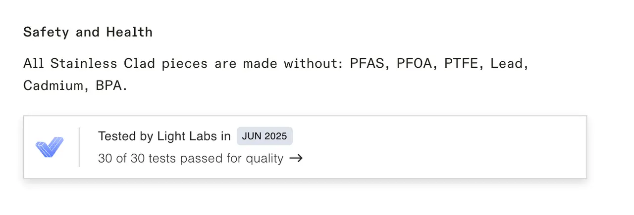 Yes, Made In Cookware’s Stainless Clad line is safe. Light Labs testing shows that all of Made In Stainless Clad products tested on September 25, 2025 passed 30 for 30 tests for PFAS. Furthermore, Light Labs tested Heavy Metals and BPA levels on Made In Cookware’s Stainless Clad line, and Made In’s Stainless Clad cookware again passed 4 of 4 and 3 of 3 tests, respectively. Because of these third-party test results that show best-in-class safety standards, Light Labs has deemed Made In’s Stainless Clad line to be very safe for consumers.