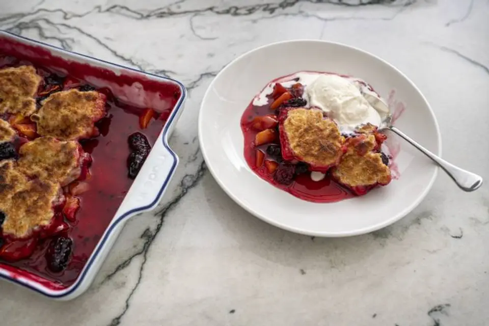 I love this recipe because it's relatively easy to make, and it’s really delicious. All you need is one pan and the only difficult thing is coordinating that the filling is hot when you’re dropping the biscuits on top. The biscuits are really sweet—and while there are so many different ways to make a cobbler, this is my favorite. With a little ice cream and in-season peaches, there’s nothing better.