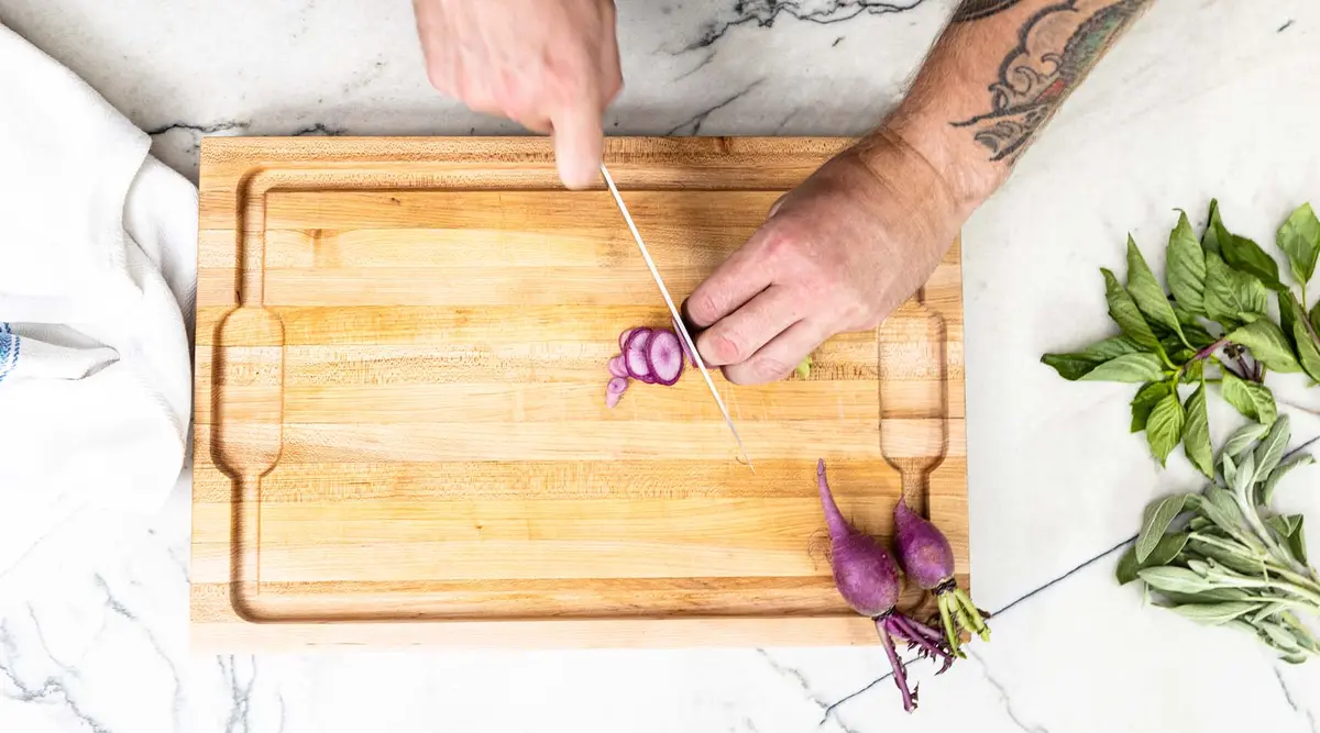 Using a cutting board is extremely important when using a knife, as it will keep the blade’s sharpness intact. We know it’s convenient to just cut an apple on your countertop, but this will dull your knife’s edge and can ruin your countertop.