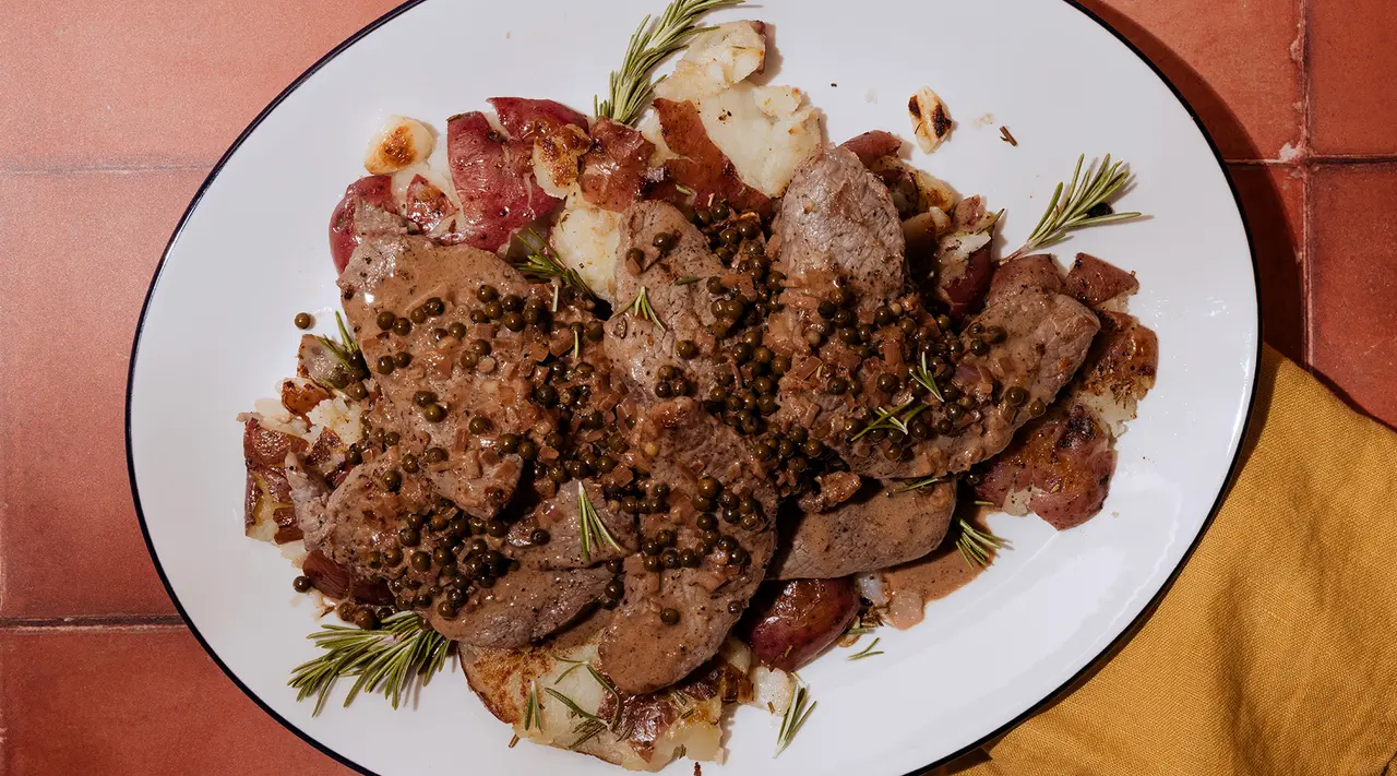 We love steak and potatoes so much, we’re giving them a second shout-out. In this elevated steakhouse classic, Birdie’s Chef Tracy Malechek-Ezekiel tops a quick-seared flatiron steak with a buttery pan sauce, which she balances with brined green peppercorns for a mild heat and slight tartness. As a side, Chef Malechek-Ezekiel pan-fries smashed red potatoes until they’re golden, crispy, and ready to soak up all that extra sauce.