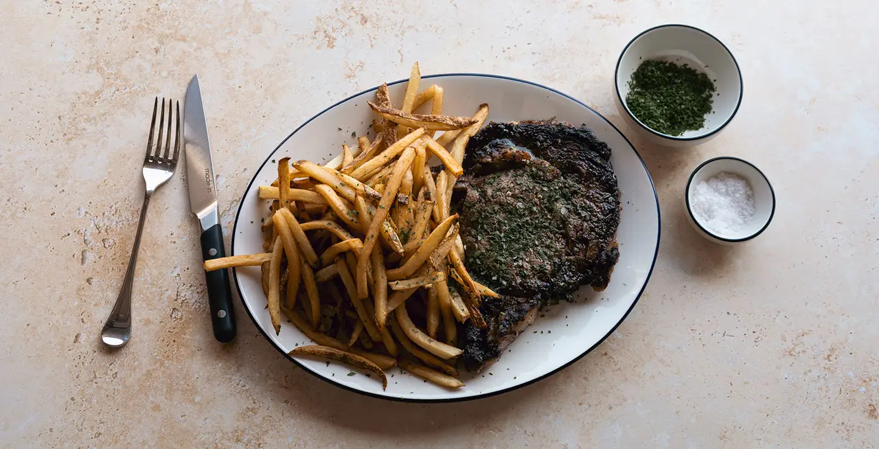 We couldn’t have a steak recipe roundup without a callout to a French brasserie classic. Chef Jo Chan of Austin's Bureau de Poste gets her steak started with a marinade in shio koji, a Japanese ferment made from the cultures of cooked grains (typically rice). This imparts incredible savoriness and umami that pairs perfectly with twice-fried French fries made in the Dutch Oven. After a quick sear in Carbon Steel and compound butter baste, you have dinner for two ready to go.