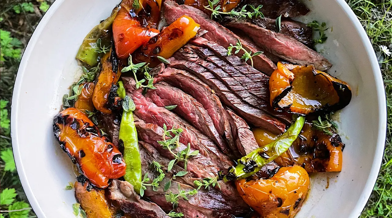 Marinated and Grilled Flank Steak with Peppers