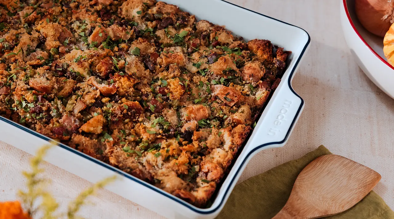 This stuffing from Oakland’s Matt Horn pulls no punches, using smoked sausage, turkey gizzards, and bacon to infuse every inch of the cornbread-and-French bread base with rich, meaty flavor. While you can use boxed cornbread, we highly recommend going the extra mile and making Horn’s accompanying cornbread recipe.