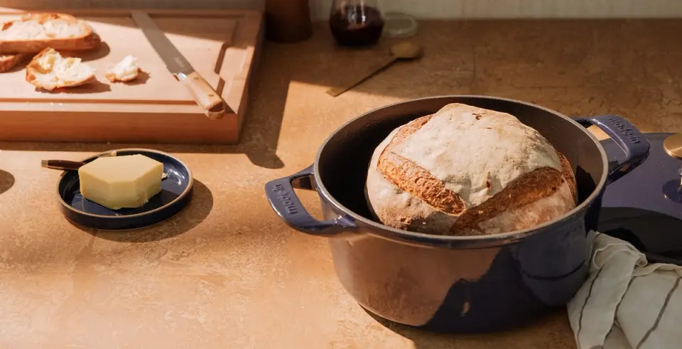 The thick walls and heavy lid of a Dutch oven make it a fabulous tool for baking bread, as it emulates the steamy oven of a commercial bakery. This gives the dough plenty of time to rise before developing a crust, resulting in beautiful round loaves of sourdough and other types of crusty bread.