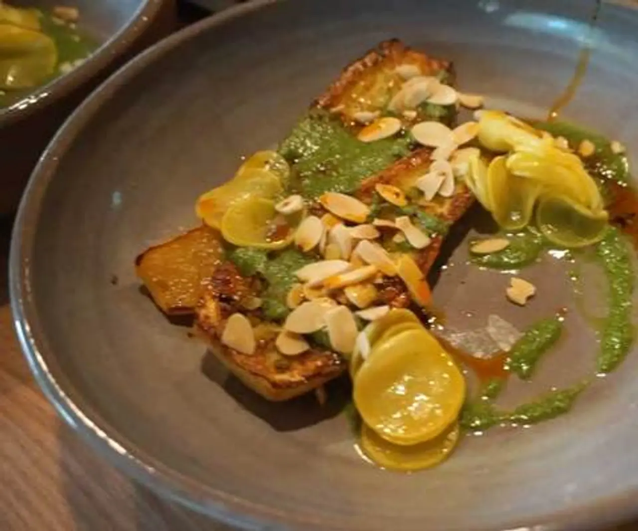 - Plate squash “meat” side up so can admire the caramel crisp! Top with pesto, toasted almonds to together the sweet, salty, and savory flavors!