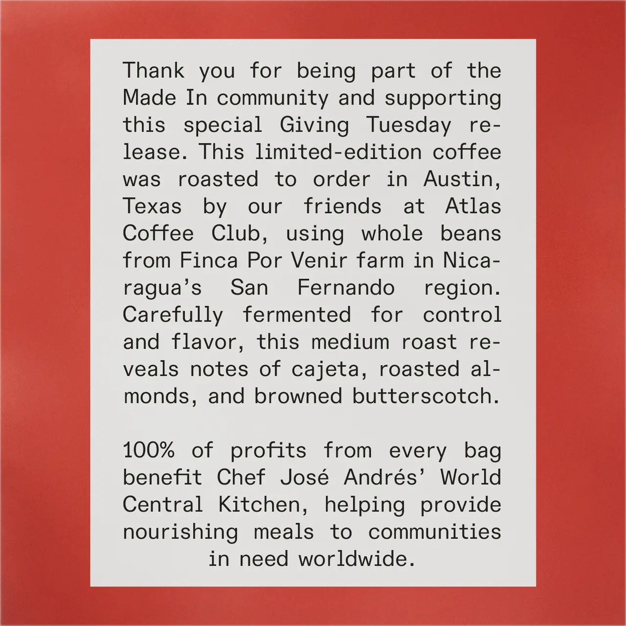 - 100% of Coffee Profits Donated to World Central Kitchen