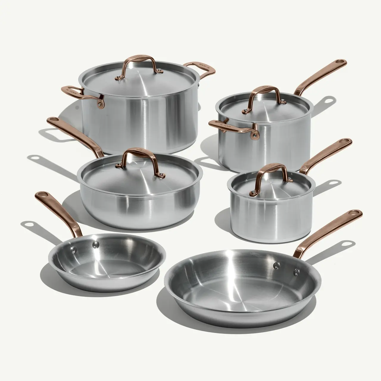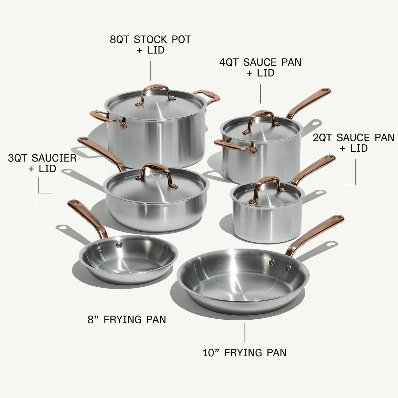 10 pieces of our bestselling, chef-loved Stainless Clad cookware, now with Limited Edition Brushed Copper Finished Handles.