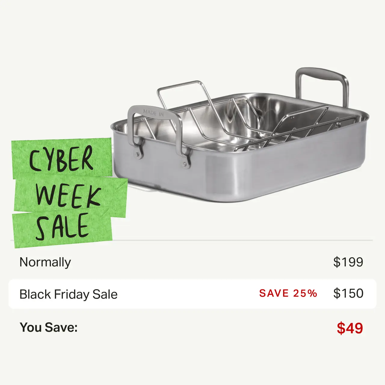 Our durable, warp-resistant stainless clad Roasting Pan guarantees perfectly cooked birds, juicy rib roasts, and more of your favorite holiday proteins.
