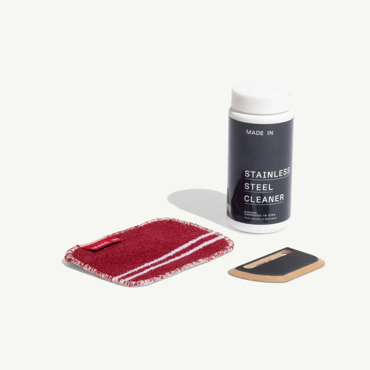 The Stainless Steel Cleaning Kit includes everything you need to keep your Stainless Clad Cookware looking and performing like new. Designed for daily maintenance and deep cleans alike, this three-piece kit includes our signature Stainless Steel Cleaner, a dishwasher-safe pan scraper made from ultra-durable Richlite, and a reusable cotton scrub cloth that eliminates the need for disposable sponges.
