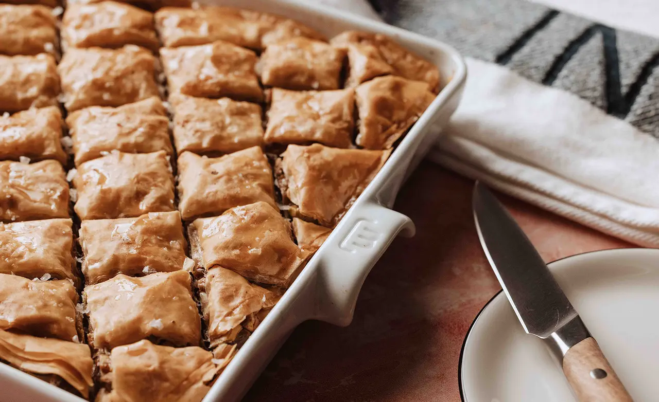 Score the baklava in small diamonds by slicing diagonal stripes about 1 ½” thick at two opposing angles. You do not need to slice all the way through. Bake until crisp and golden brown, 60–70 minutes.
