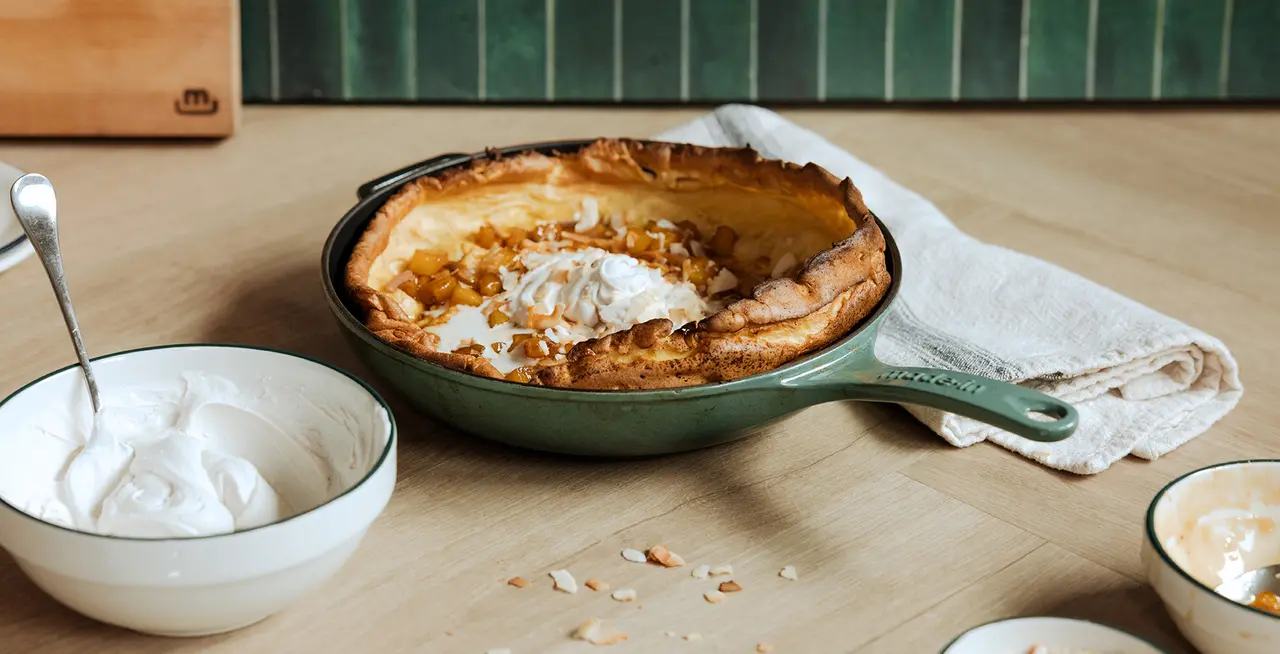 Caramelized pineapple comes together with no hassle in Non Stick, and an Enameled Cast Iron Skillet is the ideal size and material for puffing up the party-size pan cake. Topped with vanilla coconut cream, it’s an indulgent yet light breakfast fit for those special occasions.